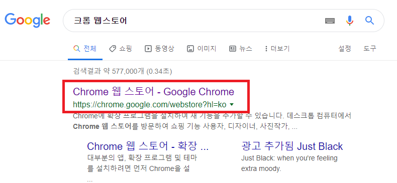 1. 크롬 구글 검색창에 크롬 웹스토어라고 검색해서 접속합니다