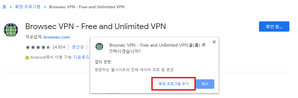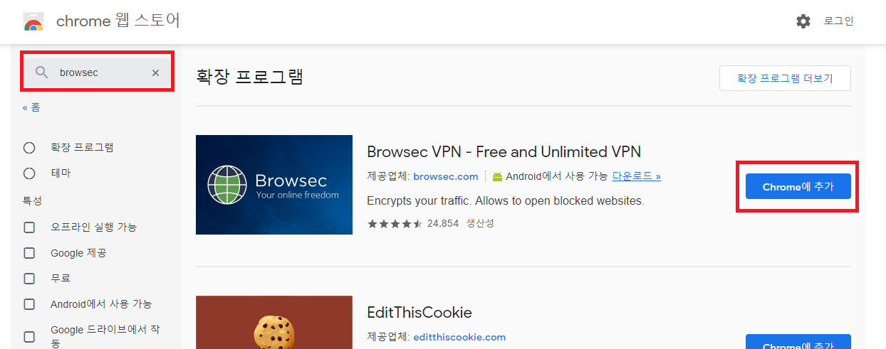 2. Chrome 웹스토어 검색창에 browsec 라는 확장 프로그램을 검색하여 설치합니다