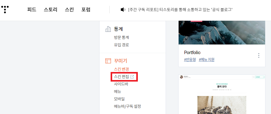 5. 티스토리 블로그 설정 화면에 가면 꾸미기 > 스킨 편집 메뉴로 이동합니다