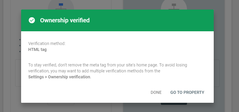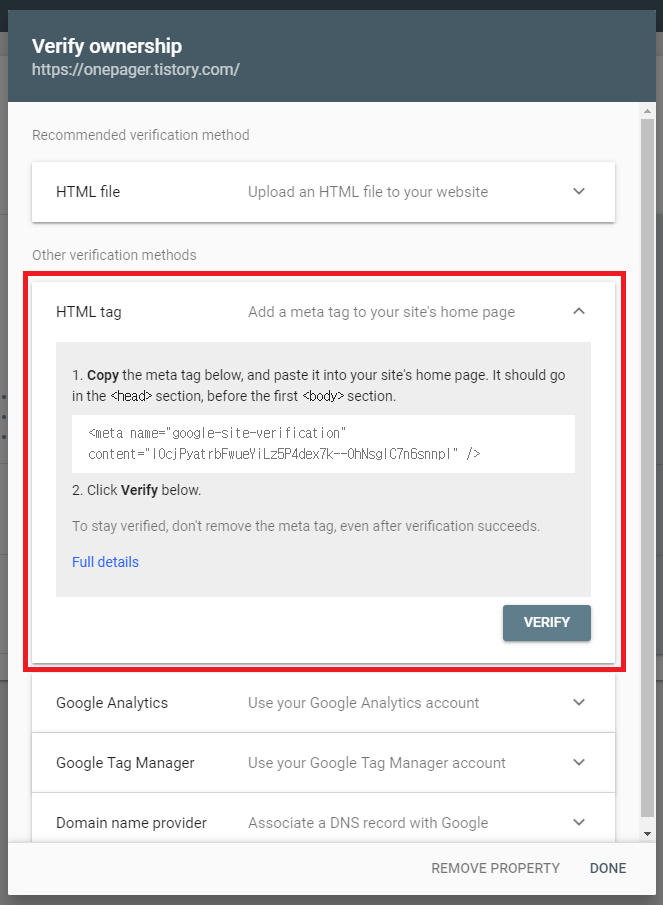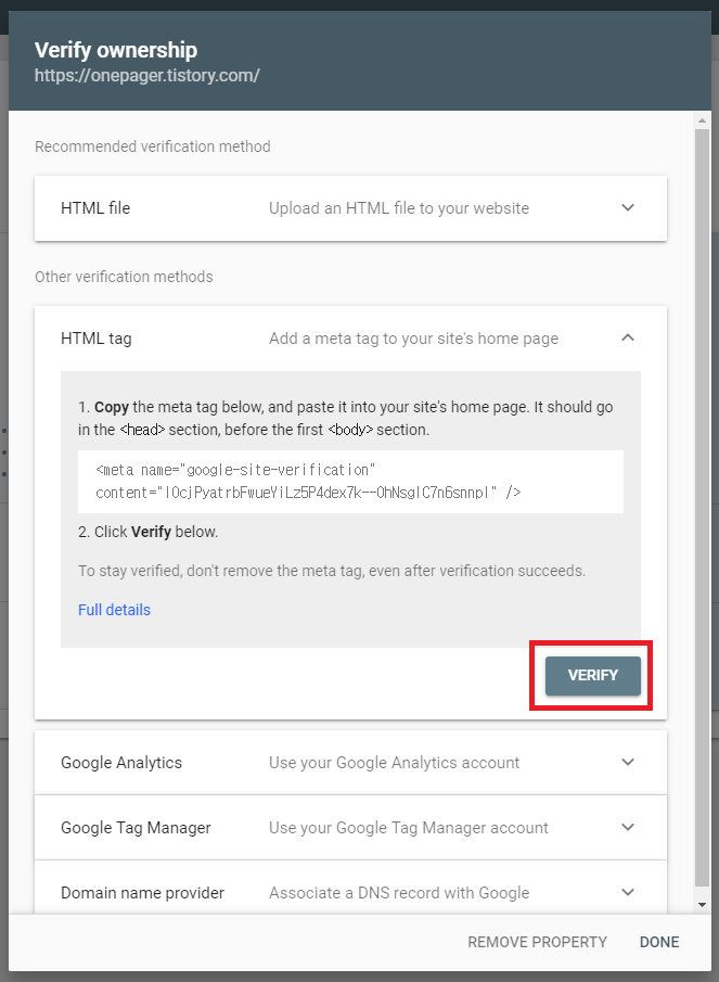 9. 잠시 후, 소유권이 확인됐다는 창이 뜹니다. 이제 기본적으로 구글 검색 등록이 끝났습니다
