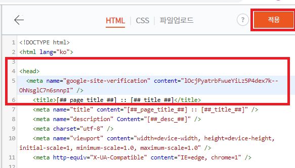 7. <head> 태그 밑에 아까 복사한 html 태그를 붙여 넣기 하고 적용 버튼을 누릅니다
