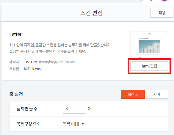 6. 현재 사용하고 있는 스킨 설정 화면에서 html 편집을 누릅니다