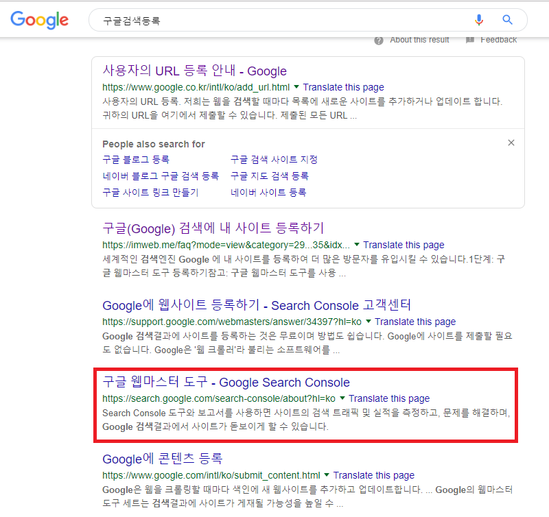 1. 구글 검색 등록으로 검색한 결과 중에 구글 웹마스터 도구 페이지로 이동합니다