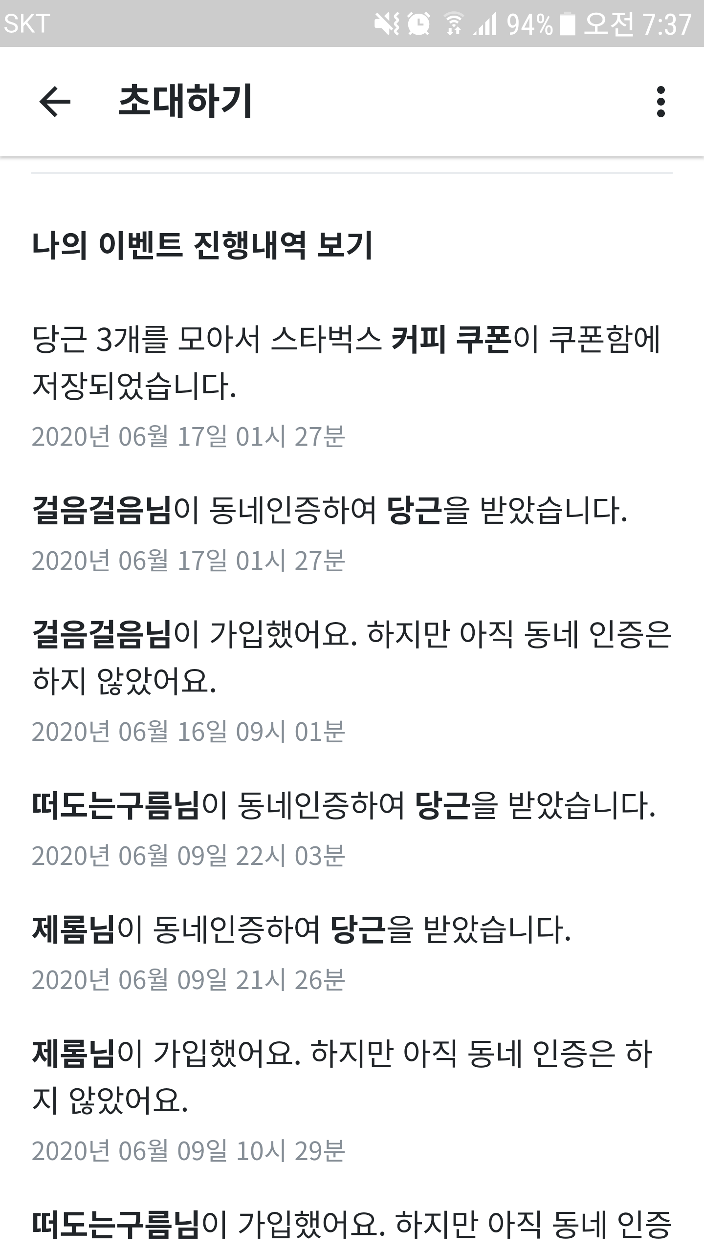 초대받은 친구들이 동네 인증까지 헤야 인정이 된다