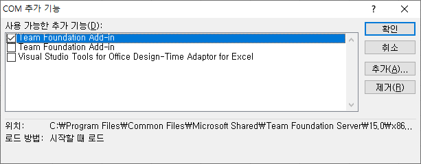 3. COM 추가 기능에서 원하는 Add-in을 선택하고 제거 버튼을 누른다