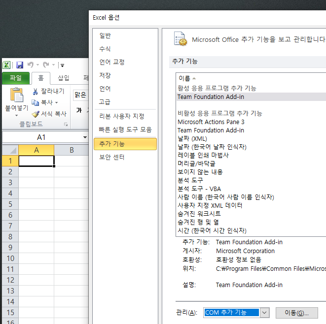 엑셀 생성 시, 오류가 발생하는 원인을 못 찾겠다면 한 번쯤 확인해보는 것을 추천한다엑셀에서 Add-in 관리 방법