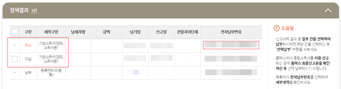 신고 내역 - 지방세 - 조회 - 검색 결과에서 전자납부번호나 금액 란을 클릭하면 신고 취소 버튼이 보입니다