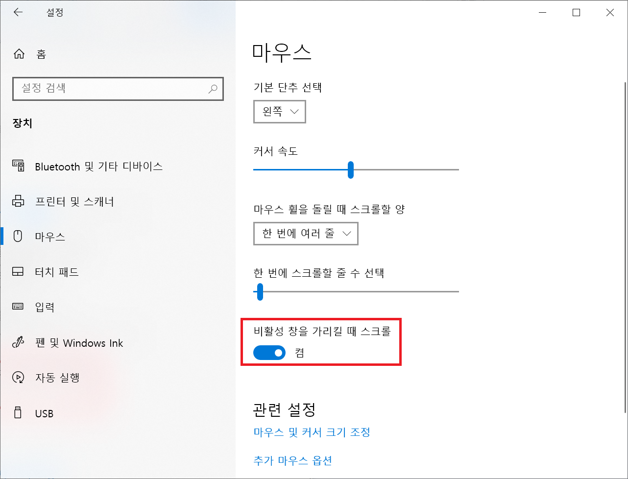 위의 화면에서 비활성 창을 가리킬 때 스크롤을 켬으로 설정을 변경해줍니다