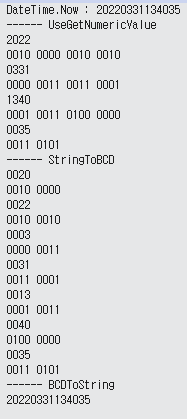 public Form1() { InitializeComponent(); DisplayBCD(); } private void DisplayBCD() { string dateTime = DateTime.Now.ToString("yyyyMMddHHmmss"); Console.WriteLine("DateTime.Now : {0}", dateTime); Console.WriteLine("------ UseGetNumericValue"); foreach (int v in UseGetNumericValue(dateTime)) { ConsoleWriteline(v); } Console.WriteLine("------ StringToBCD"); byte[] bcdByte = StringToBCD(dateTime); foreach (int v in StringToBCD(dateTime)) { ConsoleWriteline(v); } Console.WriteLine("------ BCDToString"); Console.WriteLine(BCDToString(bcdByte)); } private void ConsoleWriteline(int value) { Console.WriteLine("{0}", Convert.ToString(value, 16).PadLeft(4, '0')); string binaryStr = Convert.ToString(value, 2); int zeroCount = Convert.ToInt32(Math.Ceiling(Convert.ToDouble(binaryStr.Length) / 8)) * 8; Console.WriteLine(Regex.Replace(binaryStr.PadLeft(zeroCount, '0'), ".{4}", "$0 ", RegexOptions.RightToLeft)); } private int[] UseGetNumericValue(string value) { int[] bcd = new int[4]; bcd[0] = ((int)Char.GetNumericValue(value, 0)) << 12 | ((int)Char.GetNumericValue(value, 1)) << 8 | ((int)Char.GetNumericValue(value, 2)) << 4 | ((int)Char.GetNumericValue(value, 3)); bcd[1] = ((int)Char.GetNumericValue(value, 4)) << 12 | ((int)Char.GetNumericValue(value, 5)) << 8 | ((int)Char.GetNumericValue(value, 6)) << 4 | ((int)Char.GetNumericValue(value, 7)); bcd[2] = ((int)Char.GetNumericValue(value, 8)) << 12 | ((int)Char.GetNumericValue(value, 9)) << 8 | ((int)Char.GetNumericValue(value, 10)) << 4 | ((int)Char.GetNumericValue(value, 11)); bcd[3] = ((int)Char.GetNumericValue(value, 12)) << 4 | ((int)Char.GetNumericValue(value, 13)); return bcd; } private byte[] StringToBCD(string value) { int valueLength = value.Length; byte[] bcd = new byte[valueLength / 2]; for (int i = 0; i < valueLength; i += 2) { bcd[i / 2] = Convert.ToByte(value[i].ToString(), 16); bcd[i / 2] <<= 4; bcd[i / 2] |= Convert.ToByte(value[i + 1].ToString(), 16); } return bcd; } private string BCDToString(byte[] bcd) { StringBuilder sb = new StringBuilder(); for (int i = 0; i < bcd.Length; i++) { sb.Append(bcd[i] >> 4); sb.Append(bcd[i] & 0x0F); } return sb.ToString(); }코드 실행 결과